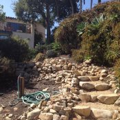 The tank stores enough water to use on a small veggie garden on the side patio and the overflow runs freely into the terraced gardens below.