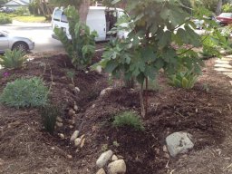 Sweetwater did a collaborative site assessment at this residence in January, 2015. Our first workshop took place in March. Youth Drought Project sheet mulched the yard the next day, to kill the lawn. Dreamscape added irrigation, a flagstone path, transplanted more roses, put in more trees and succulents too. In the summer, Sweetwater had a water harvesting workshop in the back yard. ...and a fall planting workshop in both the front and back.The garden will only get better and better as all the plants grow, mulch breaks down and creates rich soil, water gets to slow, spread and sink into the earth, and flowers and fruit flourish.