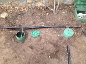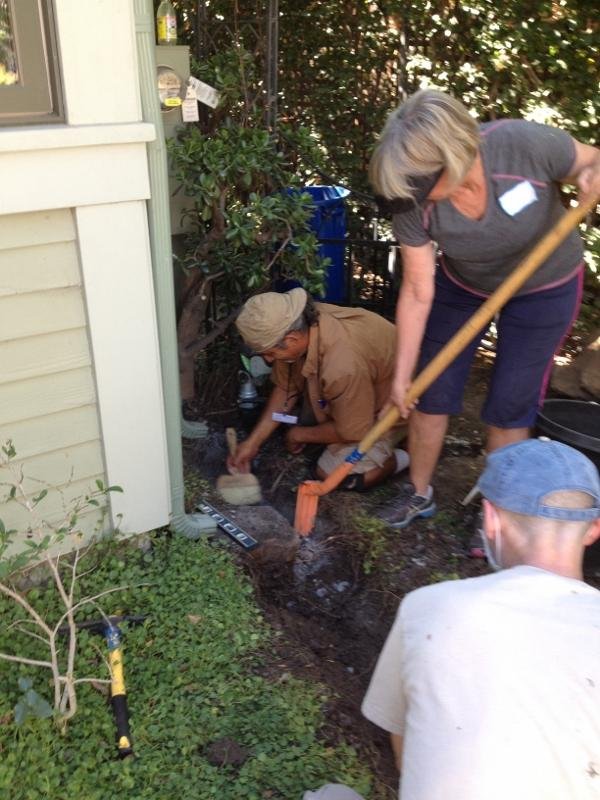 In the first workshop, we dug water harvesting basins to capture roof runoff. We measured the critical elevations with a bunyip (a water level, shown in the second picture), and added gravel and mulch to the completed basins. Our second workshop was a planting extravaganza.